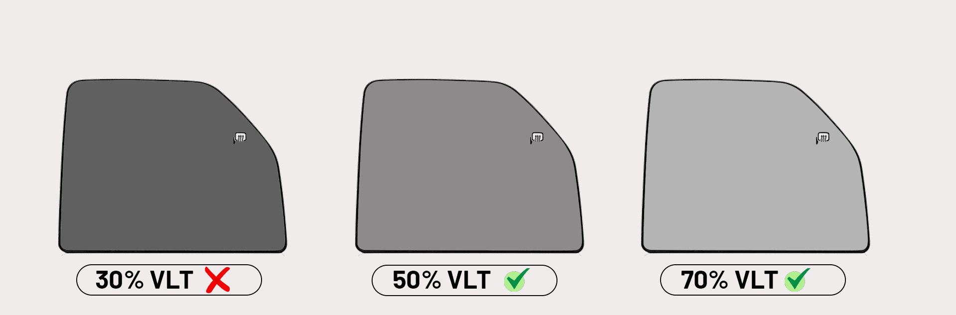 - Side windows (left and right): A minimum of 50% VLT shall be permitted.